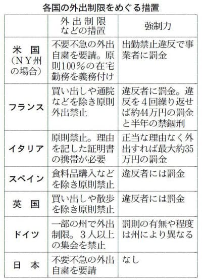 安倍晋三首相は4月7日、7都府県に対して緊急事態宣言を出した。同日の記者会見では「(人の接触の)7割から8割削減を目指し外出自粛をお願いする」と求めつつ「今回の緊急事態宣言は、海外で見られるような都市封鎖、ロックダウンを行うものではまったくない」「罰則があるようなものではない」「警察が取り締まるということはない」と、あくまで国民の自主的な行動変容を求めるものであることを強調した。